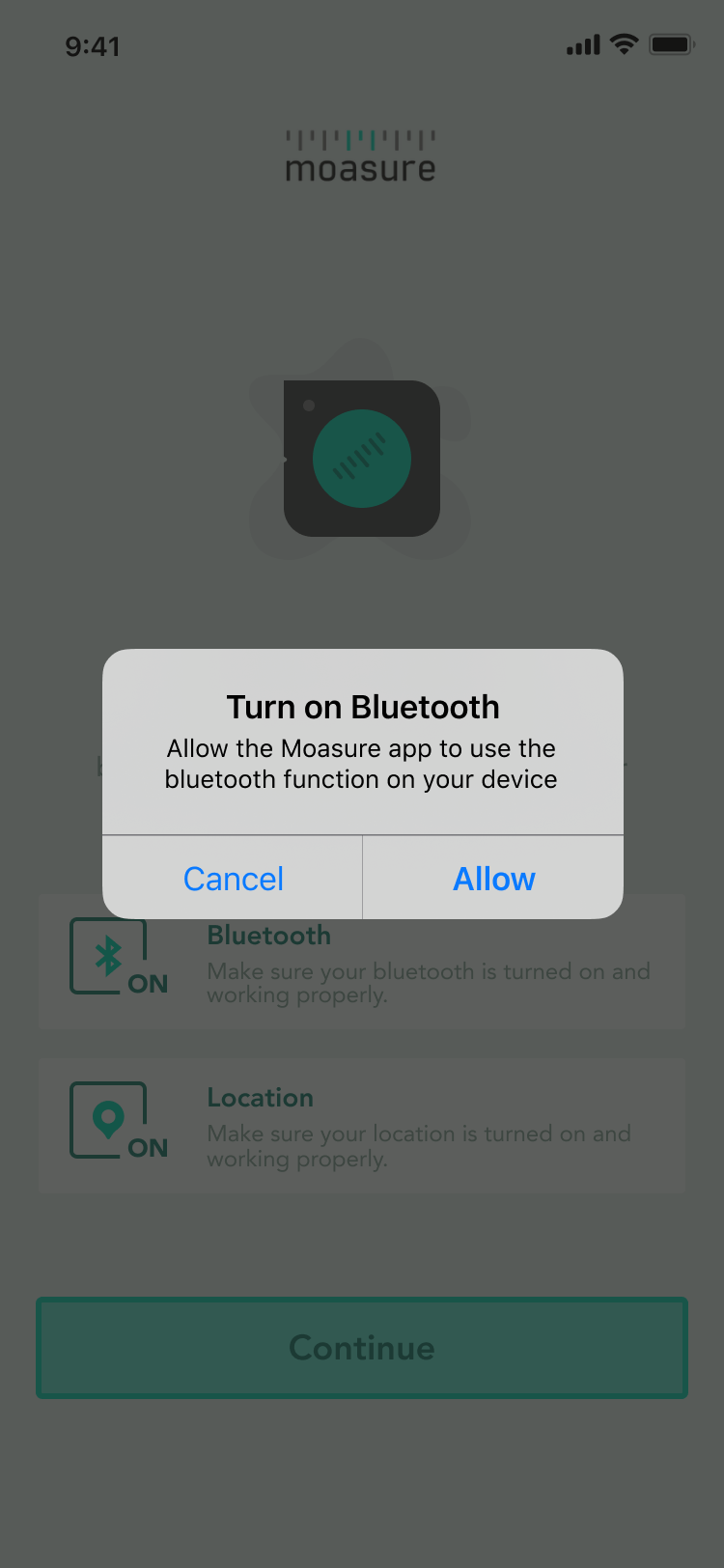 Una volta toccato il pulsante, tocca Consenti per concedere l'autorizzazione e consentire all'app Moasure di utilizzare il Bluetooth del dispositivo.
