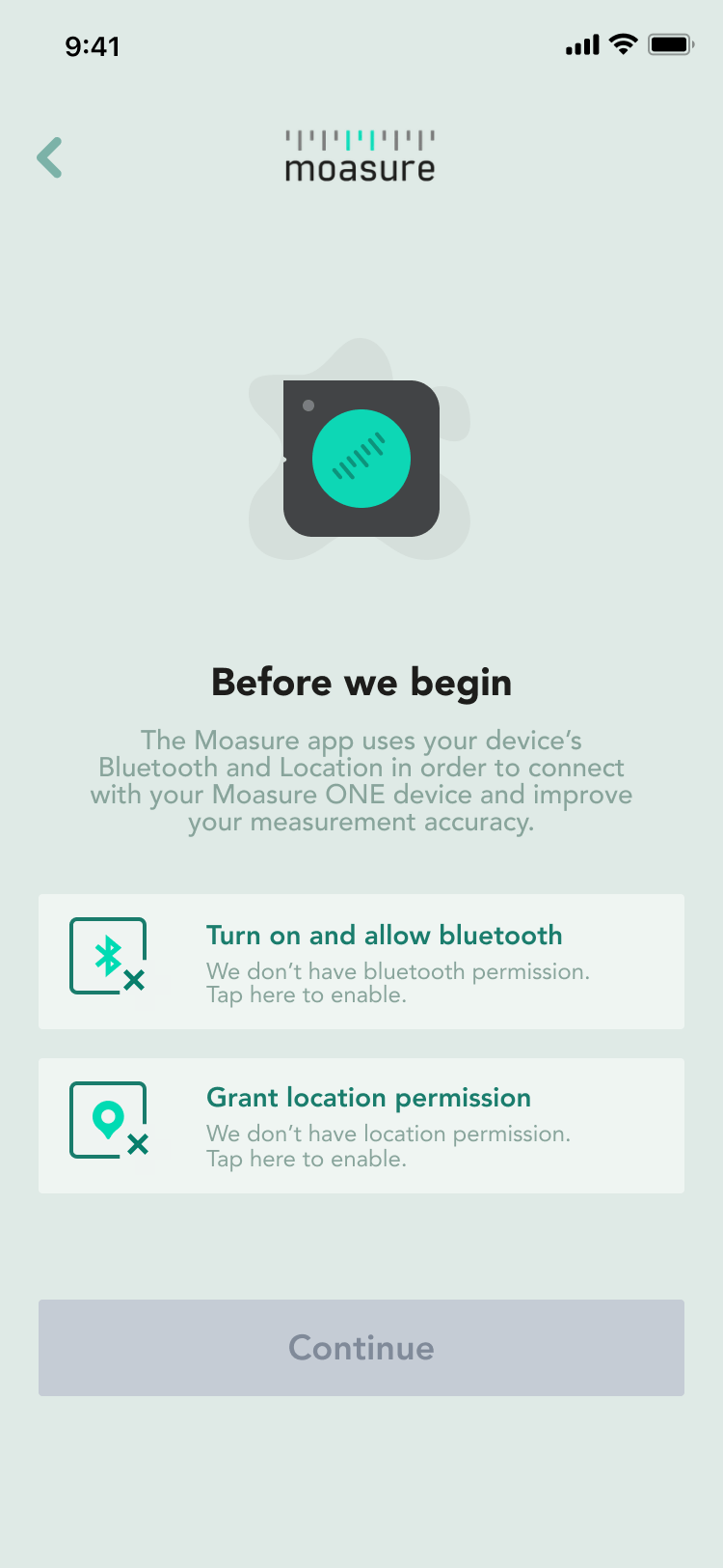 Quando apri l'app Moasure per la prima volta, ti verrà chiesto di connettere e associare il tuo dispositivo.