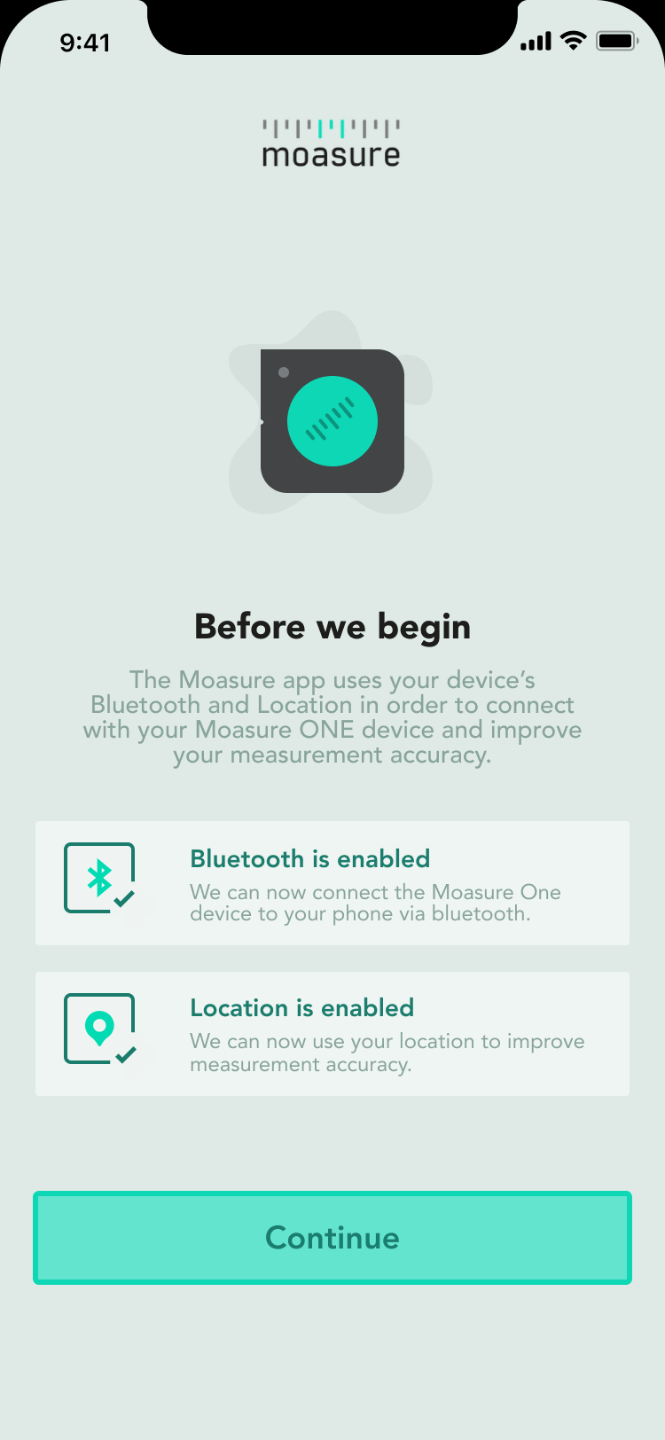 Wanneer u de Moasure app voor het eerst opent, wordt u gevraagd verbinding te maken en uw apparaat te koppelen.