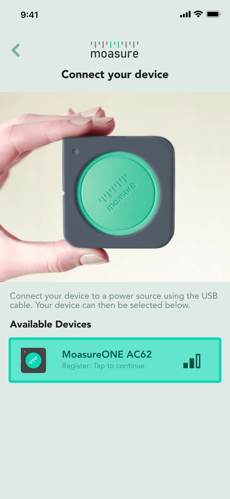 U wordt nu gevraagd uw Moasure-apparaat aan te sluiten op een voedingsbron met behulp van een USB-kabel en het apparaat in te schakelen. Hierdoor kan de app via Bluetooth naar uw apparaat zoeken.
