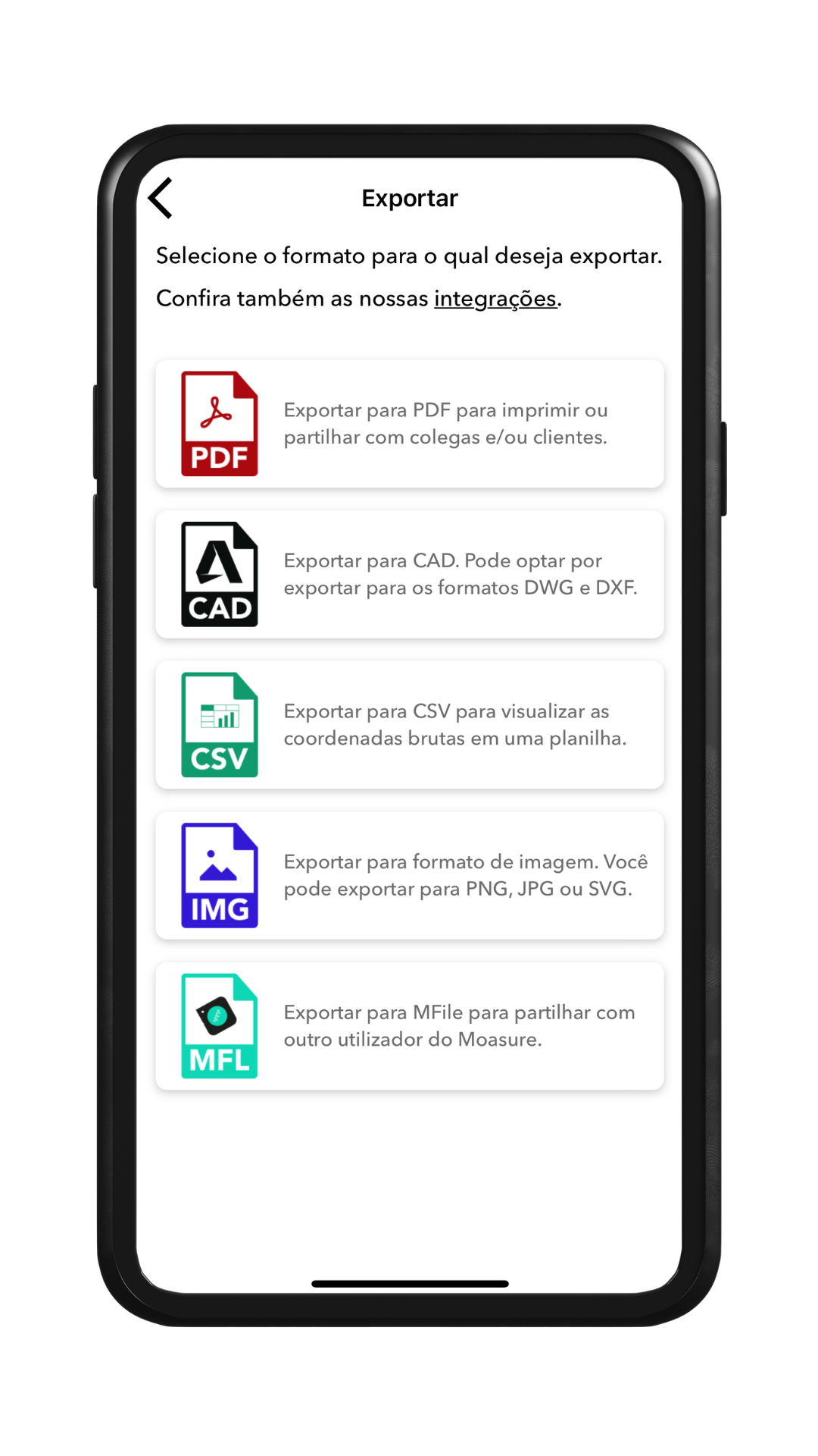 * **Ficheiro MFile:** pode exportar em MFile para partilhar com outra aplicação Moasure.