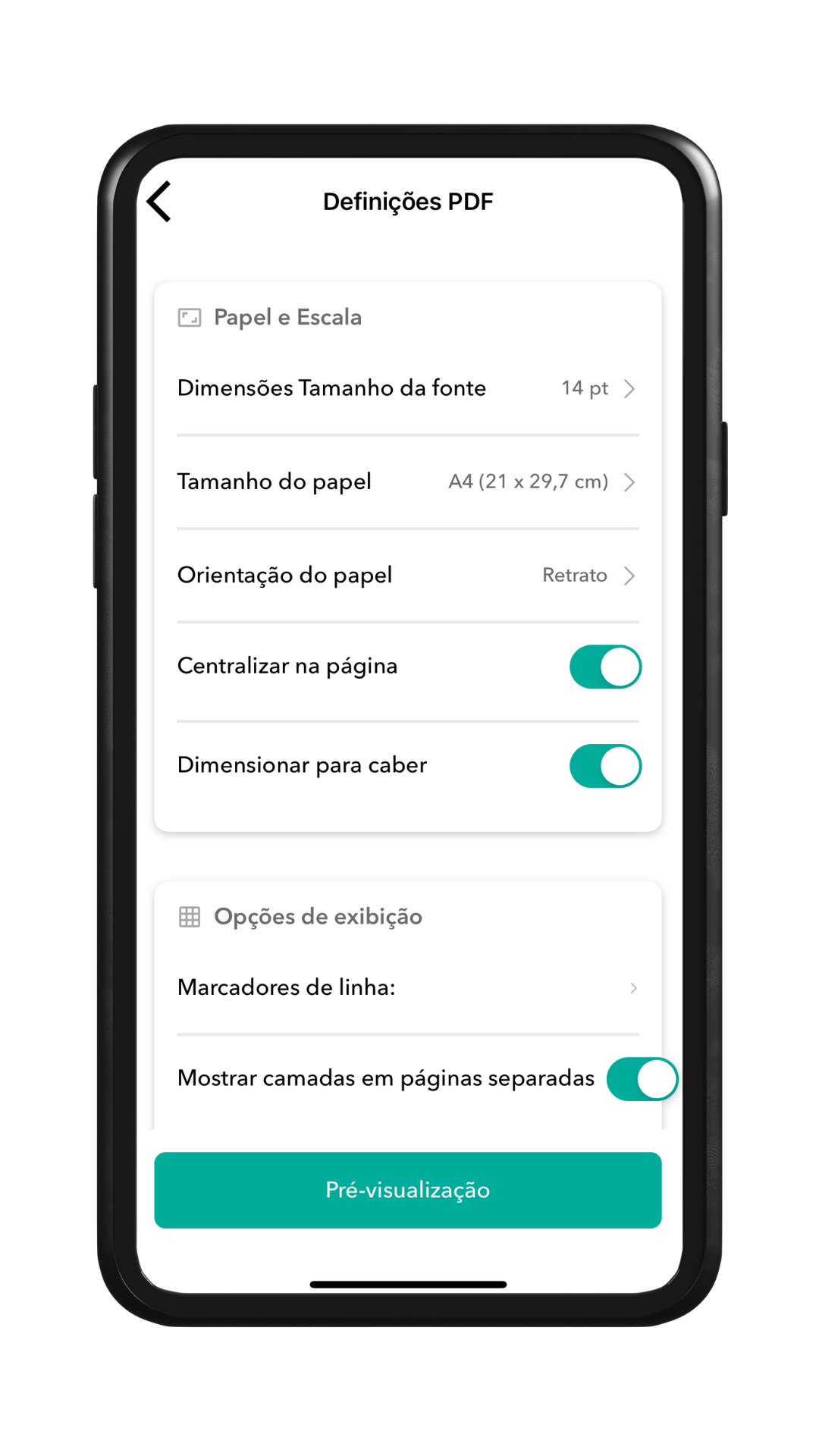 Ao exportar para PDF, pode alterar as opções de configuração predefinidas para personalizar o documento conforme a sua conveniência. É possível **pré-visualizar** como as opções afetam o PDF antes da exportação, clicando em **Mostrar Pré-visualização** na parte inferior da aplicação.