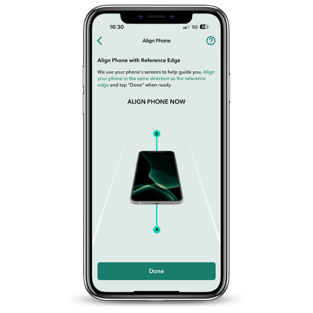 Moasure använder din smartphones kompass för att guida dig till de inmatade koordinaterna. För att detta ska fungera korrekt är det viktigt att du riktar in telefonen i samma riktning som referenskanten. Referenskanten utgörs av de två första punkterna som hjälper till att orientera enheten, med start från ursprungspunkten. När dessa har mätts in fastställs dina X- och Y-axlar. Nu kan du trycka på Klar.