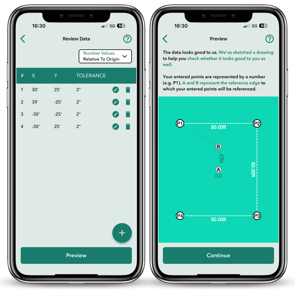 När du har matat in alla dina koordinater och är nöjd med dem, tryck på Förhandsvisa. Appen kommer att skissa en ritning för att hjälpa dig kontrollera att datainmatningen är korrekt.