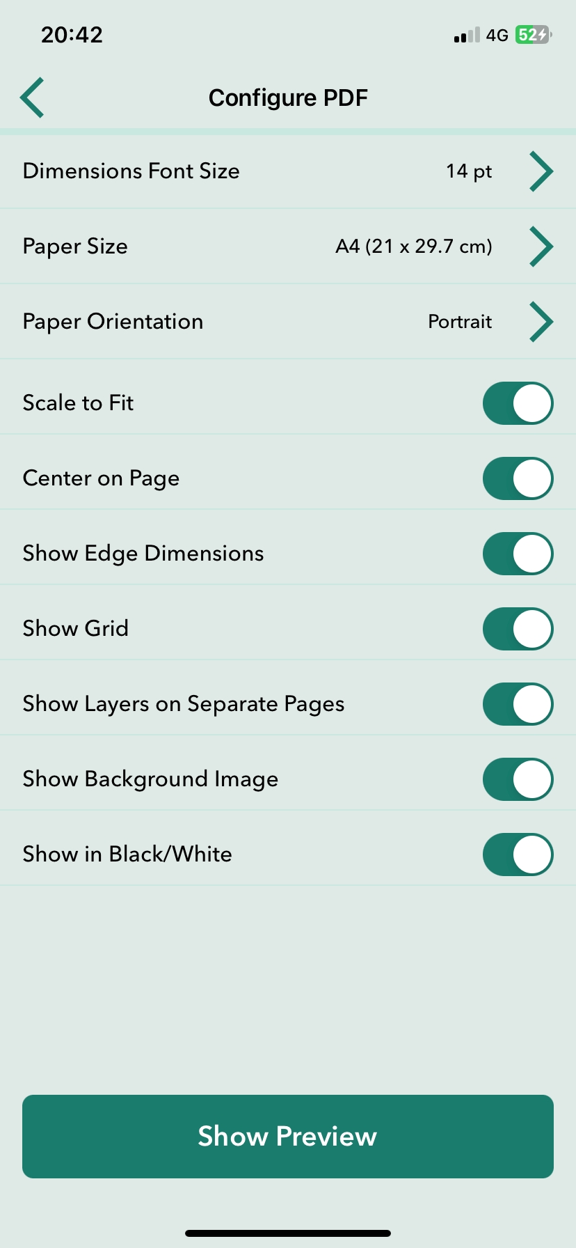 När du exporterar till PDF kan du välja att ändra de förvalda konfigurationsalternativen för att anpassa PDF efter dina önskemål. Du kan förhandsgranska hur konfigurationsalternativen påverkar PDF innan export genom att trycka på Visa förhandsgranskning längst ned på PDF-konfigurationsskärmen.